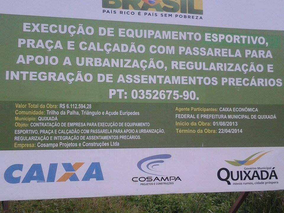 A obra seria executada através de convênio firmado entre a Prefeitura de Quixadá e a Caixa Econômica Federal