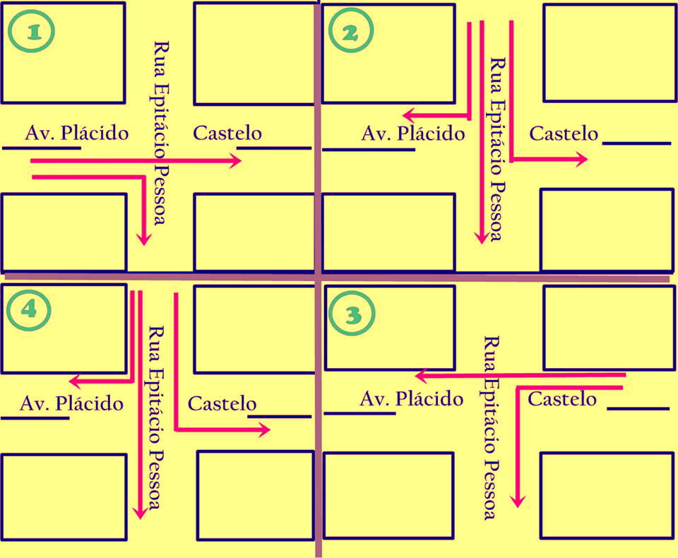 Além de não haver sinalização horizontal nas vias públicas, não há faixas de pedestres nem linha de limite para parada de carros sob nenehum dos semáforos da cidade