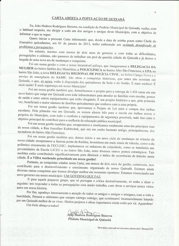 O Prefeito de Quixadá, João Hudson Bezerra, assinou uma carta aberta à população do município na qual se declara perseguido, diz que mudou a realidade da cidade, descreve as obras que supostamente teriam sido executadas por sua gestão e promete mais “obras e serviços nunca visto antes em nossa história”.