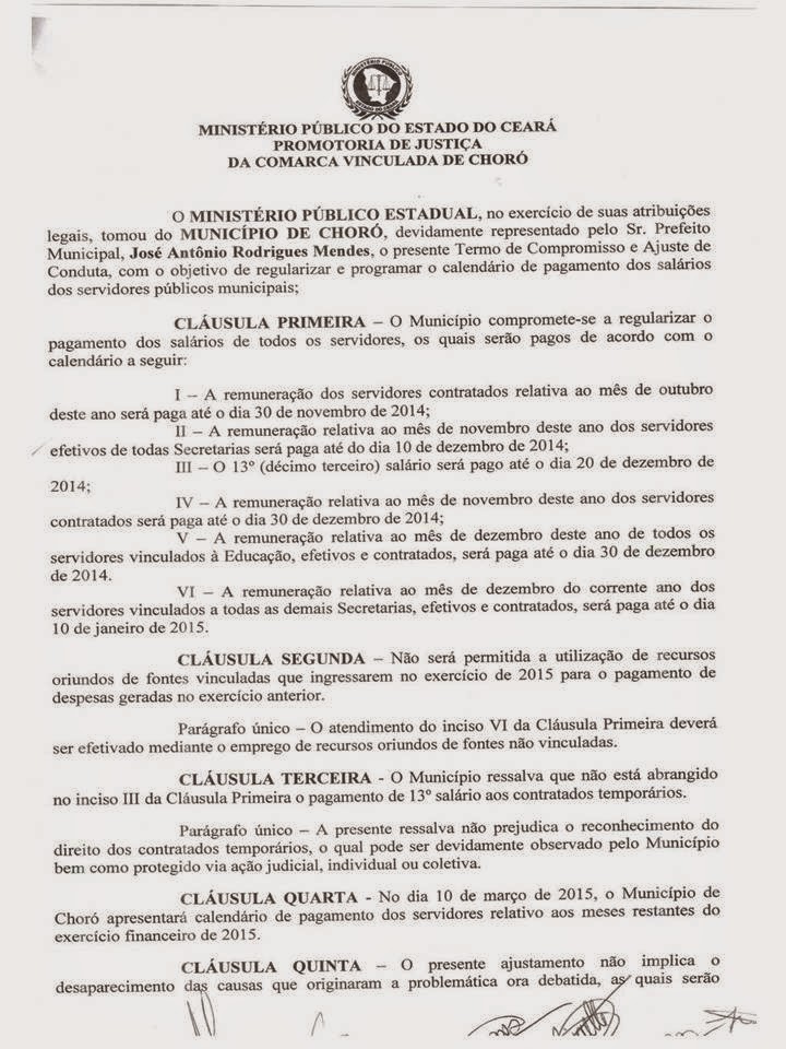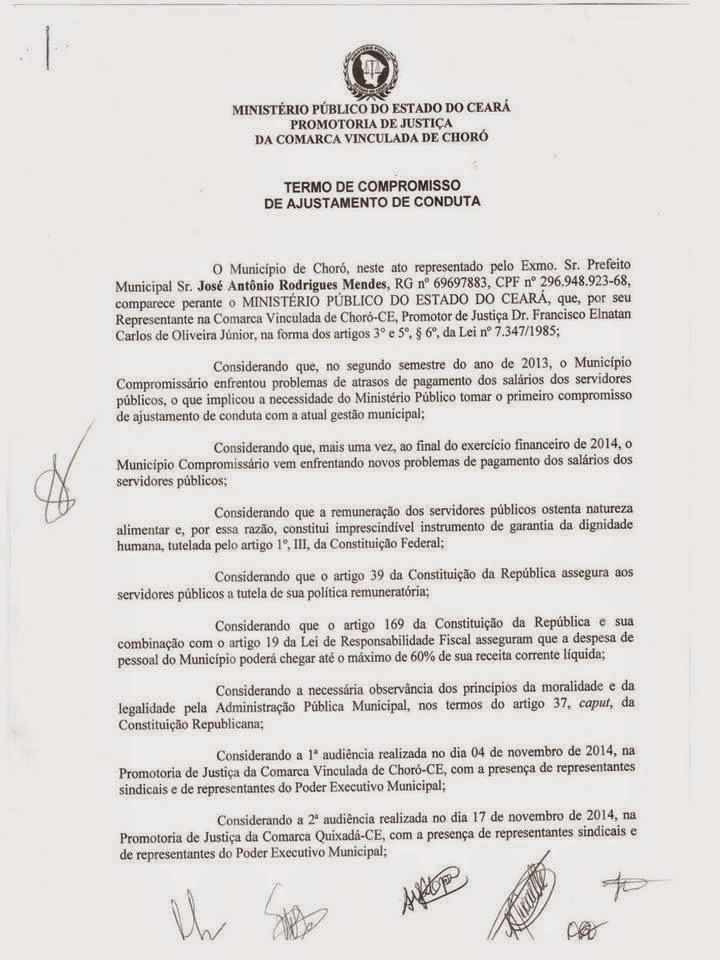 O Ministério Público Estadual, representado pelo Promotor de Justiça, Dr. Elnatan Oliveira, firmou com a prefeitura de Choró um Termo de Compromisso e Ajustamento de Conduta (TAC) com o objetivo de regularizar a situação salarial dos servidores daquele município.