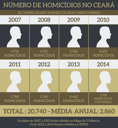 Especialmente a capital cearense, Fortaleza, sente os efeitos da falência das políticas de segurança públicas levadas a cabo pelo governador Cid Gomes. A cidade foi considerada a 13ª mais violenta do mundo em 2013. No ano seguinte, já pulou para a 7ª colocação. E os números oficiais da SSPDS comprovam: somente em 2014, a cada dia, 9,8 pessoas são mortas apenas em Fortaleza.