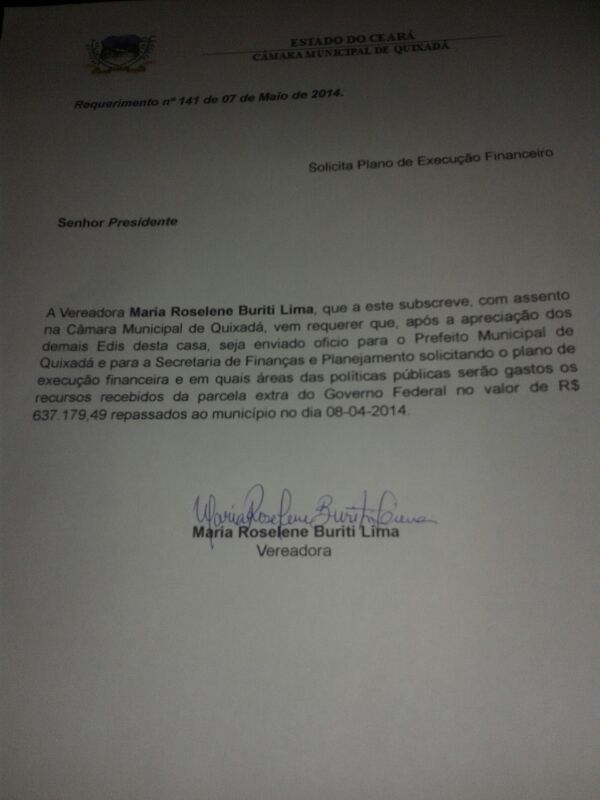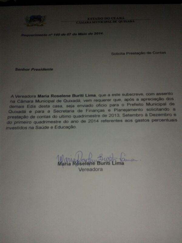 No requerimento Nº 140, exibido na foto abaixo, a parlamentar solicitou que os vereadores enviassem um ofício ao Prefeito João Hudson e à Secretaria de Planejamento e Finanças, solicitando a prestação de contas ainda do último quadrimestre de 2013, a saber, setembro, outubro, novembro e dezembro, bem como do primeiro quadrimestre de 2014, janeiro, fevereiro, março e abril. Os vereadores querem conhecer os percentuais gastos em saúde e educação, pré-estabelecidos em lei.
