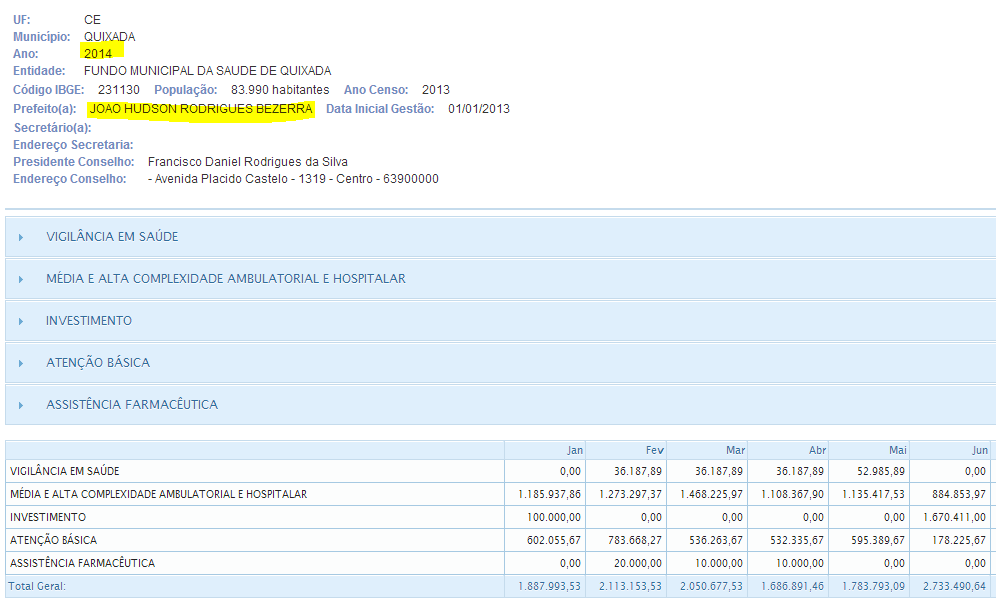 As transferências de recursos para a manutenção dos serviços de saúde em Quixadá, feitas mensalmente pelo Governo Federal no ano de 2014, já atingem o montante de quase R$ 13 milhões. A informação é do portal do Fundo Nacional de Saúde, mantido pelo Ministério da Saúde.