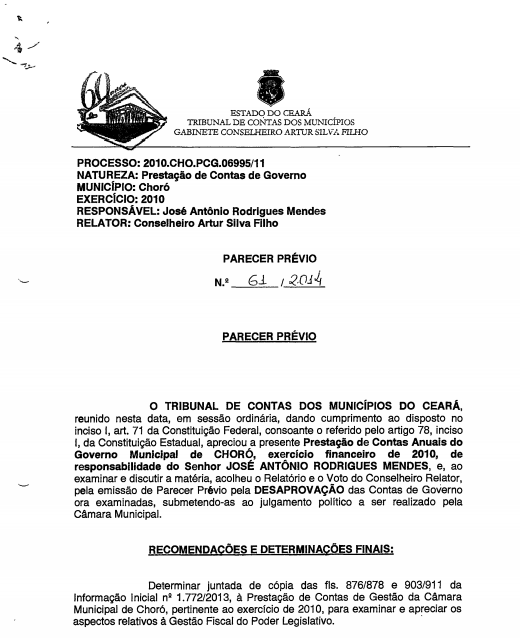 O Tribunal de Contas dos Municípios já havia votado pela desaprovação das contas do prefeito de Choró, José Antônio Rodrigues Mendes (Dé),