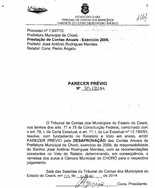 O parecer pela desaprovação das contas foi expedido pelo TCM no dia 03 de julho deste ano e encaminhado para a Câmara Municipal, que ainda deverá fazer o seu julgamento. Cabe indagar se os vereadores, a maioria dos quais são da base de apoio ao prefeito, seguirão a recomendação dos técnicos do TCM ou se decidirão pelo caminho oposto.